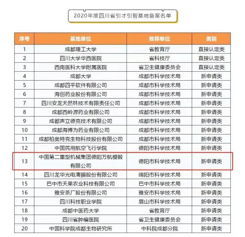 (通訊員 唐慶)近日,四川省科學(xué)技術(shù)廳發(fā)布2020年度四川省引才引智基地備案名單,萬(wàn)航模鍛獲批為四川省引才引智基地。