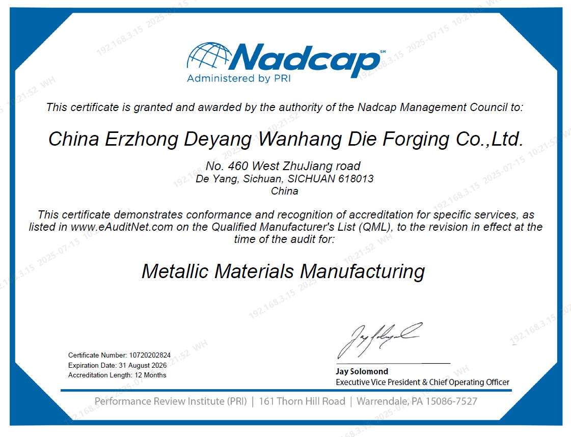 近日,萬航模鍛順利通過國際權(quán)威認(rèn)證機構(gòu)NADCAP的嚴(yán)格審核,成功獲得鍛造特種工藝認(rèn)證證書,成為國內(nèi)少數(shù)具備NADCAP鍛造資質(zhì)的企業(yè)。