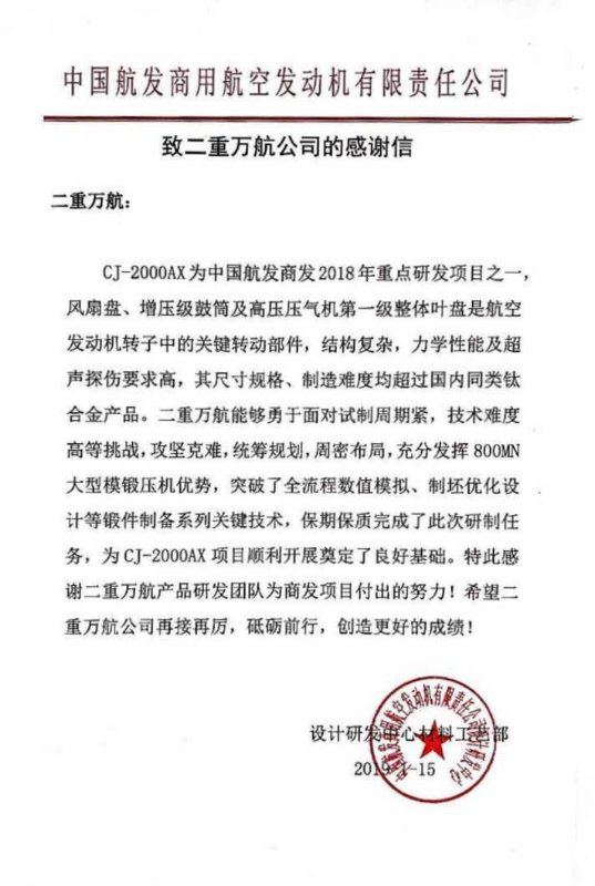 中國航發(fā)商發(fā)在感謝信中對萬航公司CJ-2000AX項目關鍵轉(zhuǎn)動部件的研發(fā)制造給予充分肯定,指出,二重萬航能夠勇于面對試制周期緊,技術難度高等挑戰(zhàn),攻堅克難,統(tǒng)籌規(guī)劃,周密布局,充分發(fā)揮800NM大型模鍛壓機優(yōu)勢,突破了全流程數(shù)值模擬、制坯優(yōu)化設計等鍛件制備系列關鍵技術,保期保質(zhì)完成了此次研制任務,其尺寸規(guī)格、制造難度均超過國內(nèi)同類鈦合金產(chǎn)品,為CJ-2000AX項目順利開展奠定了良好基礎。同時,感謝二重萬航產(chǎn)品研發(fā)團隊為商發(fā)項目付出的努力。