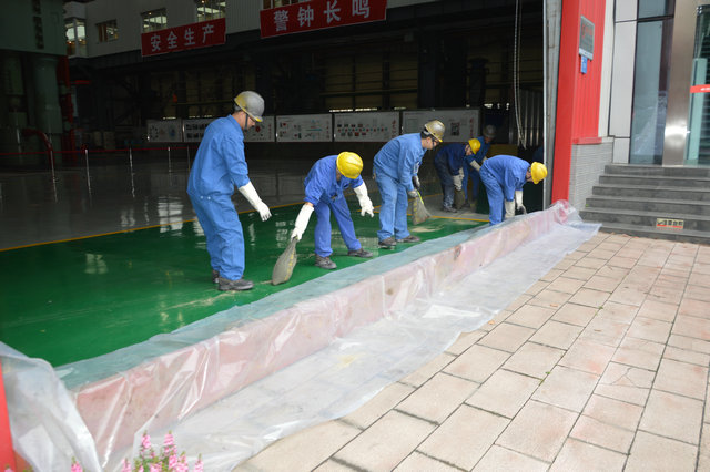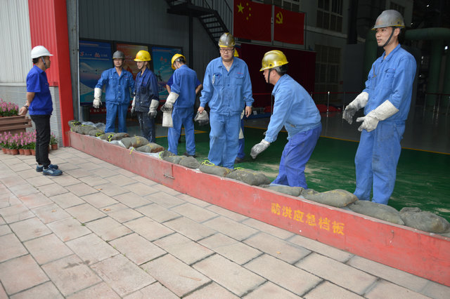 圖:模鍛廠應(yīng)急防洪隊員在800MN壓機跨南門堆建防洪墻